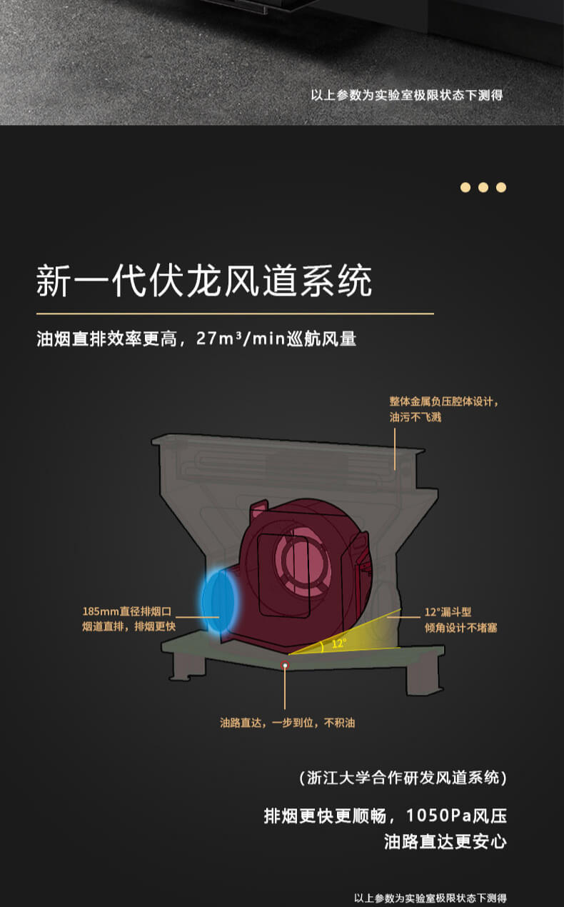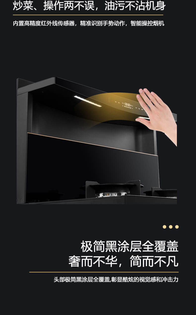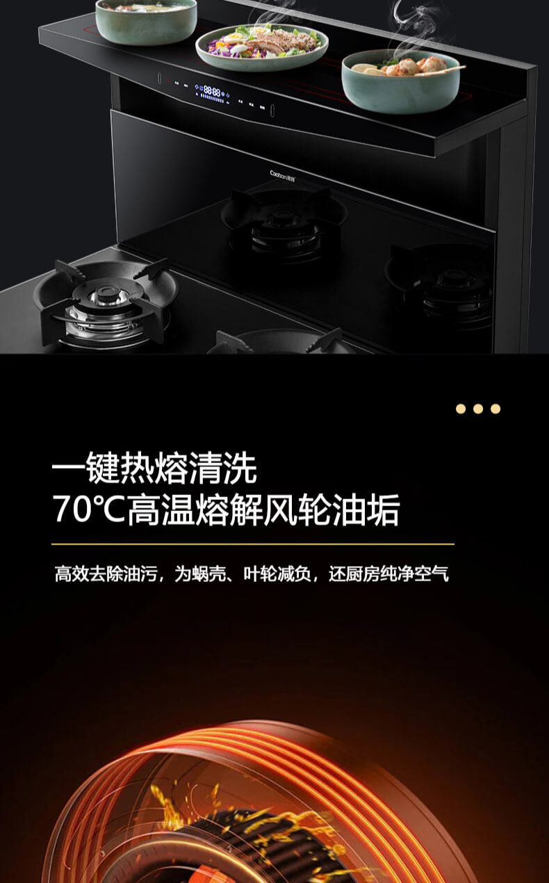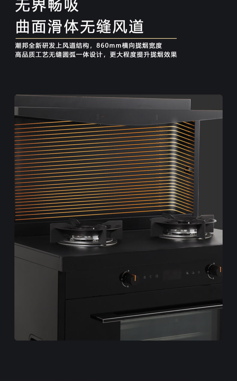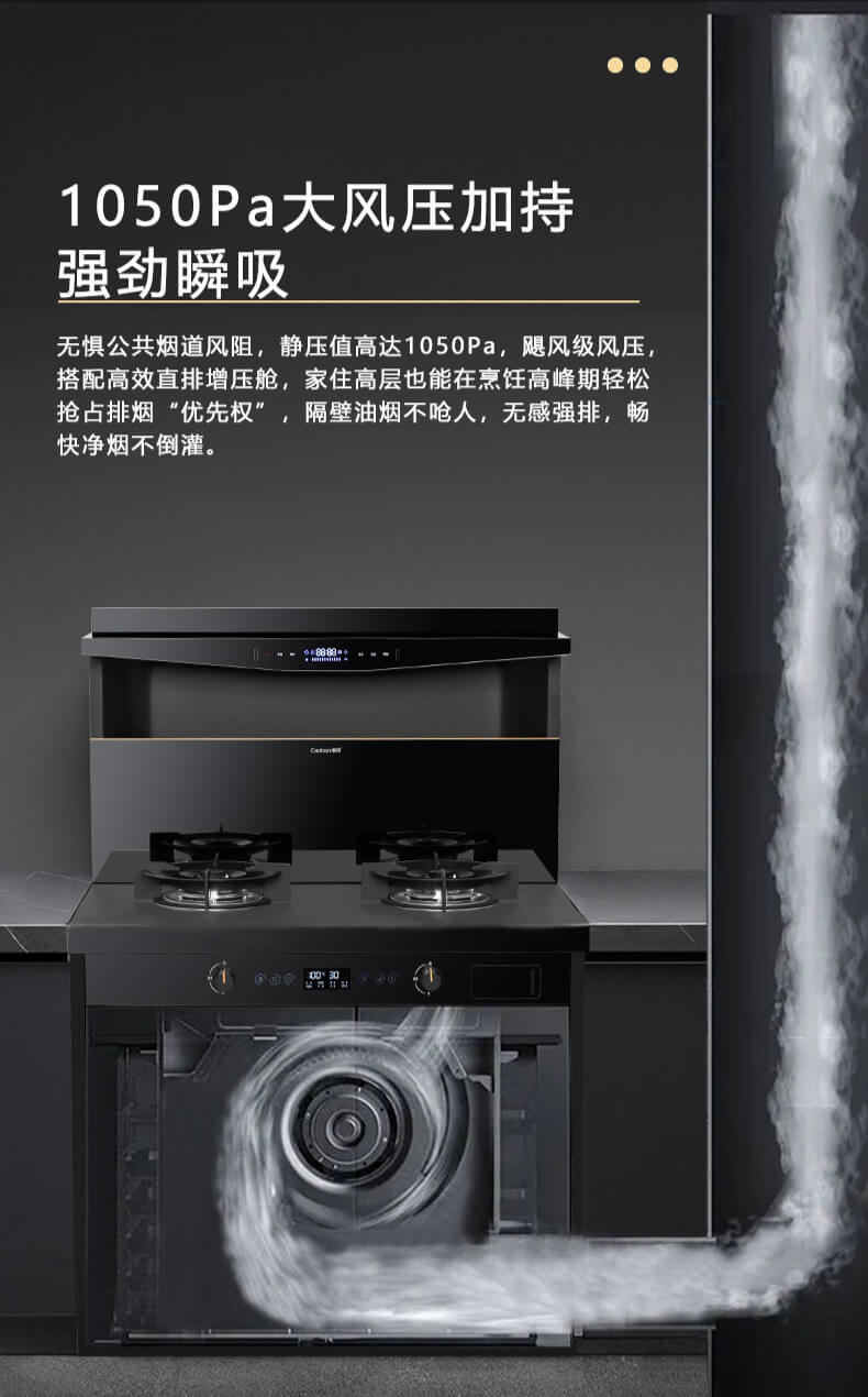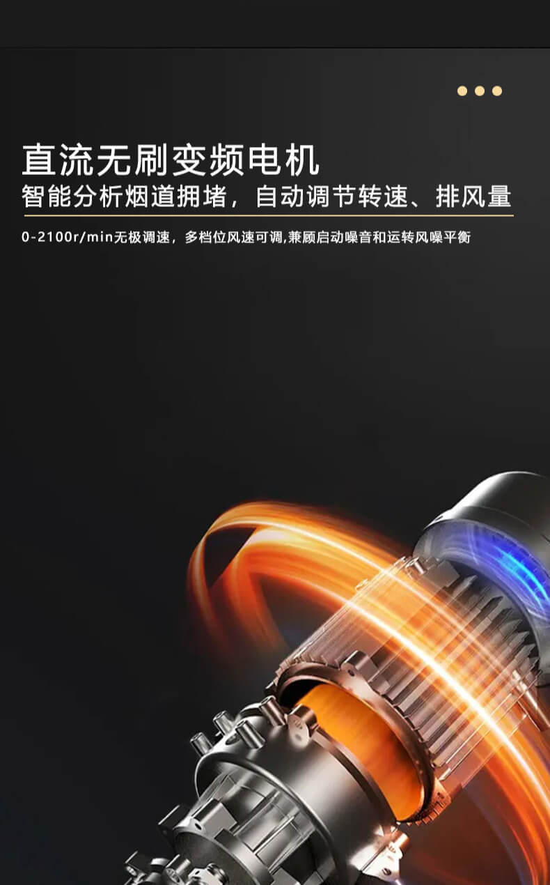 1050Pa風壓,智能變頻電機,揮手智控,曲面滑體無縫風道,一體瓷膜內膽,一鍵熱融清洗,5kW大火力