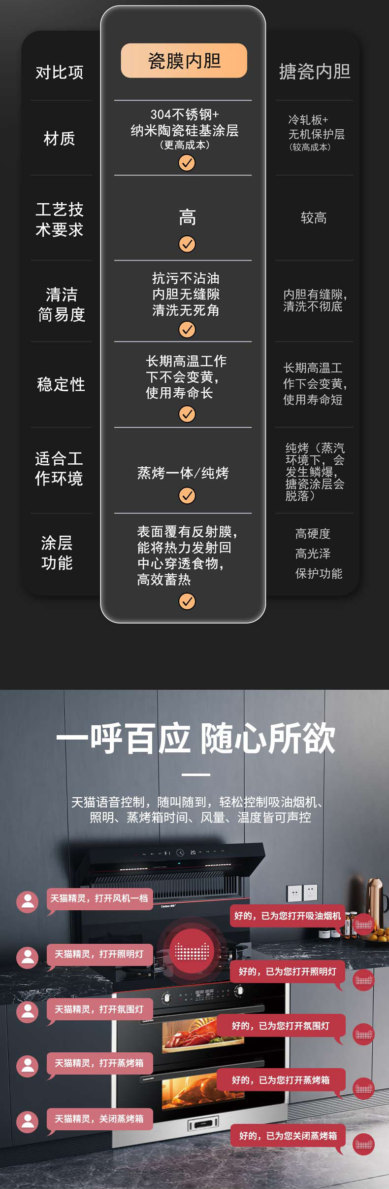 上蒸下烤,蒸烤獨(dú)立。智能控制,寬體瓷膜內(nèi)膽。