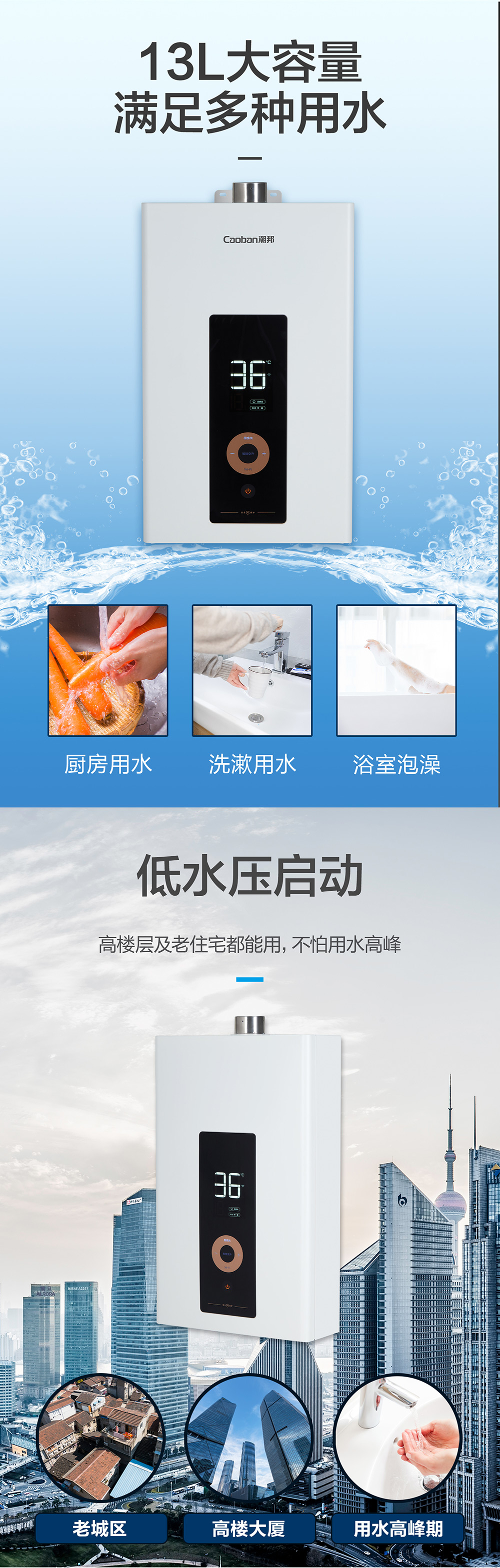 智能恒溫,用氣用水防護(hù),低水壓?jiǎn)?dòng)。